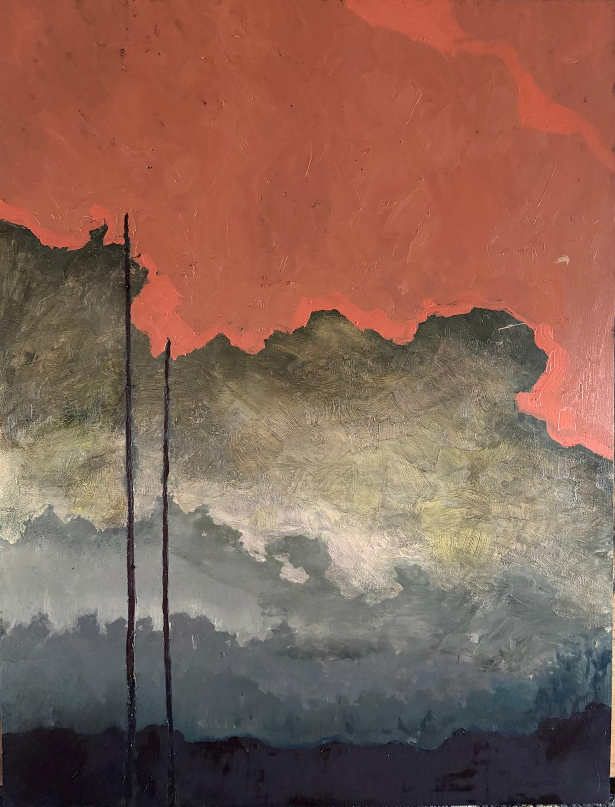 Schilderij met titel: ‘Dorre bomen onder roze lucht.’ Geschilderd met olieverf op paneel.