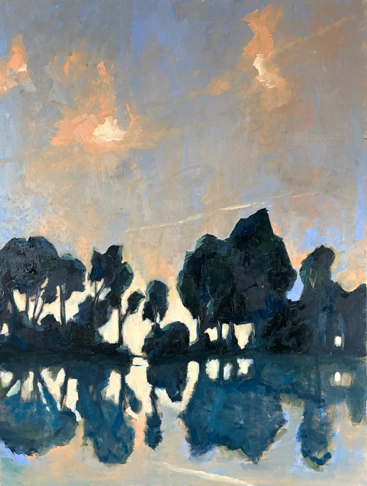 Schilderij met titel: ‘Ochtend zon met bomenrij en reflectie.’